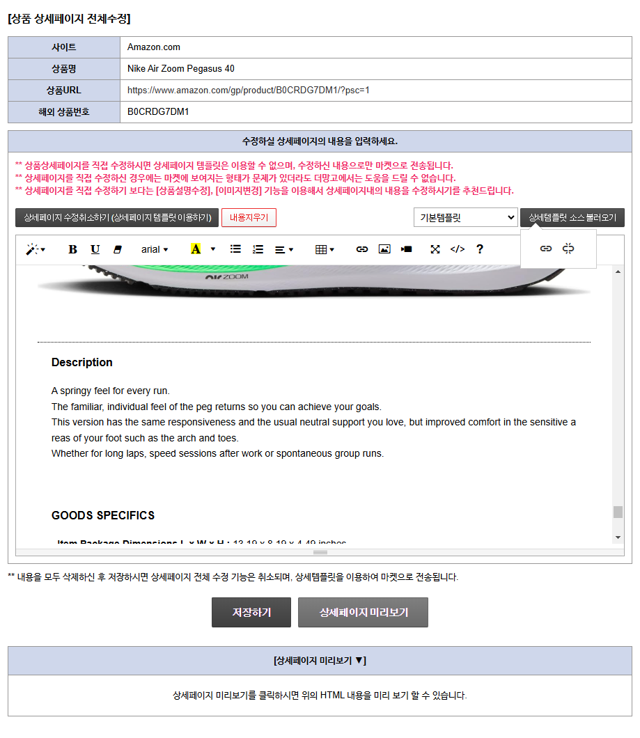 각종링크&기능의상세페이지전체수정버튼을 클릭하시면 (오픈) 마켓으로 전송되는 상품 상세페이지를 직접 만들거나 수정할 수 있습니다.
