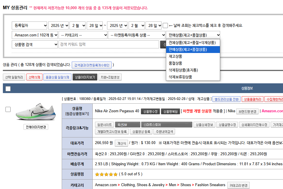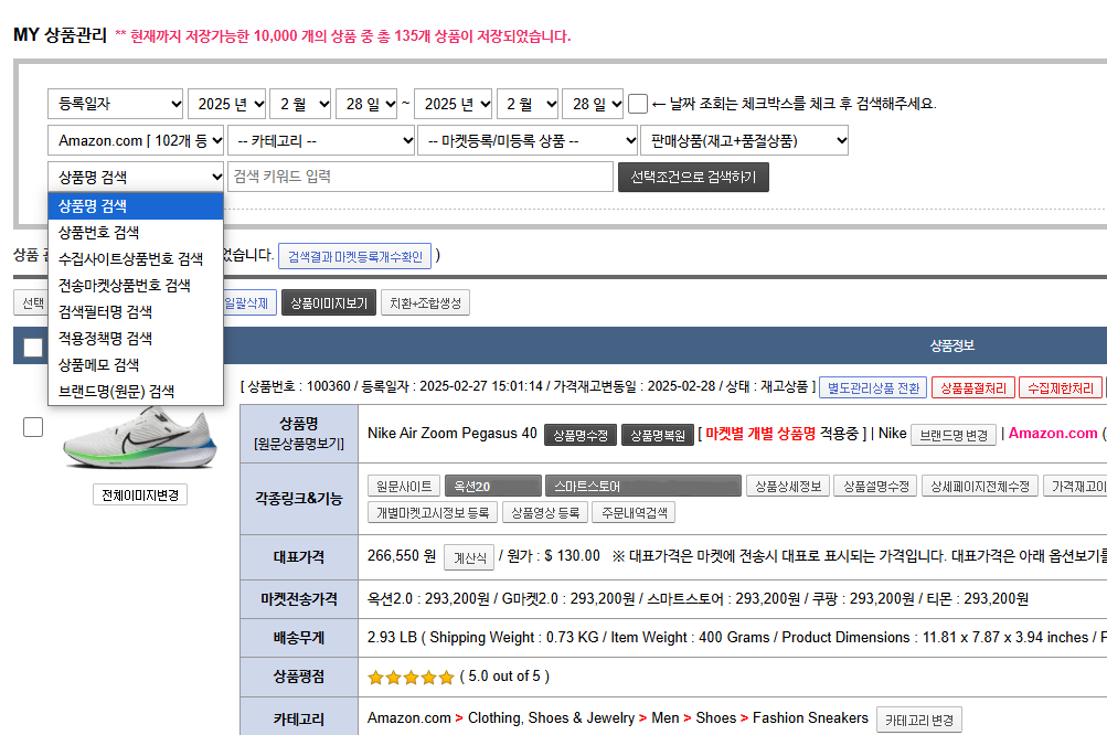 - 상품 검색을 이용하는 메뉴는상품관리, 상품업데이트&마켓전송, 전송마켓삭제, 상품번역/복원 메뉴등에서 이용합니다.