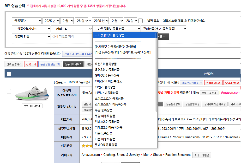 마켓별 등록된 상품 또는 미등록된 상품을 검색할 수 있습니다.