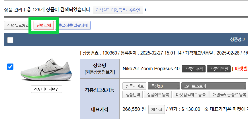 - 상품을 검색하신 후에 원하신 상품을 선택하여 삭제 또는 검색된 모든 상품을 삭제할 수 있습니다.
