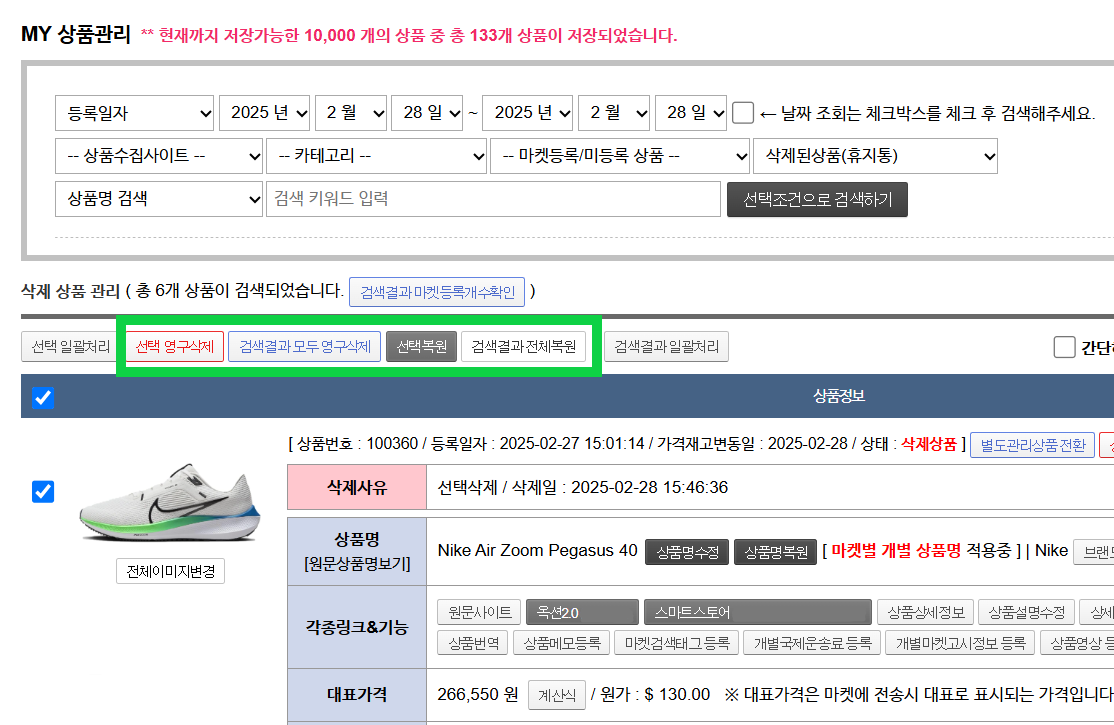 - 삭제된 상품으로 검색하시면영구삭제버튼 및복원버튼이 활성화 됩니다.