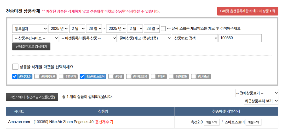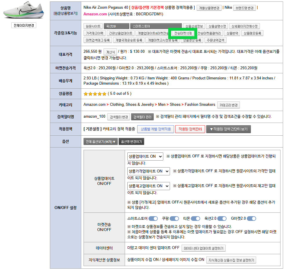 -각종링크&기능의전송마켓삭제버튼을 클릭하면 등록된 마켓의 상품을 삭제할 수 있습니다.
