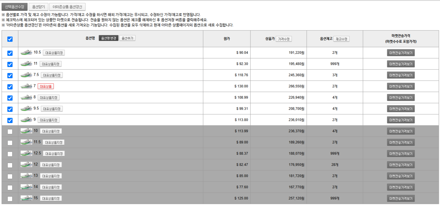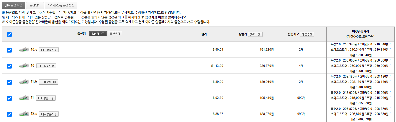 - 체크 해제 된 옵션을 다시 선택 후 수정(저장)하시면 해당 옵션은 활성화되어 마켓으로 전송이 가능합니다.