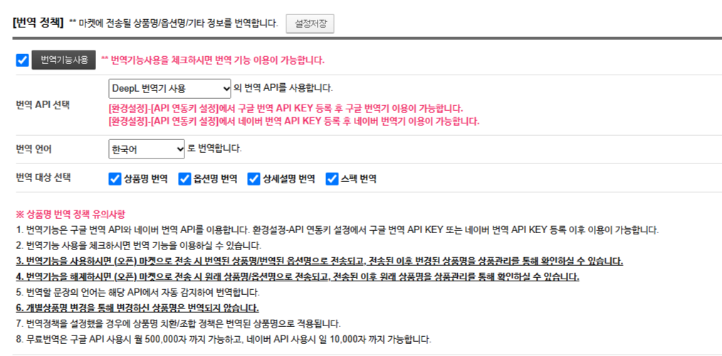 7. 번역정책을 설정했을 경우에 상품명 치환/조합 정책은 번역된 상품명으로 적용됩니다.