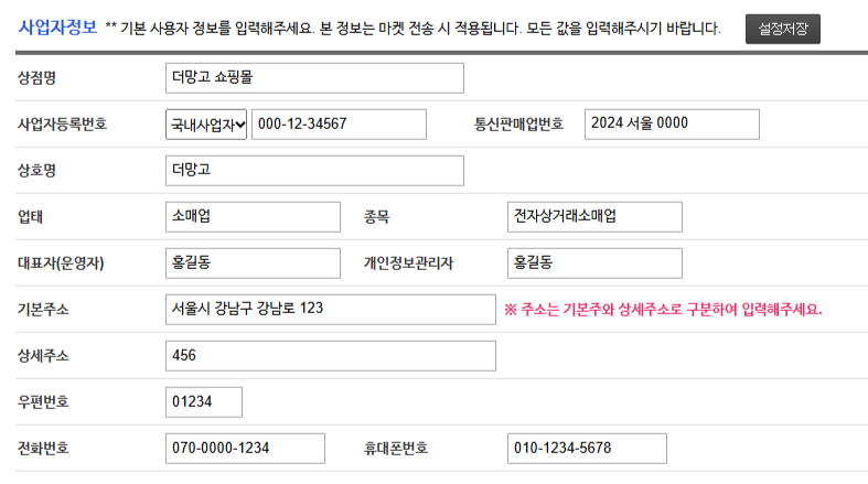 - 사업자정보는 마켓에 전송될 때 같이 전송되는 정보입니다. 정확한 정보를 입력해주시기 바랍니다.