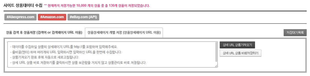 상세페이지 개별저장(세팅방식) 메뉴는 수집사이트 상품 페이지 URL을 이용하여 상품을 1개씩 저장하고자 할 때 이용하는 메뉴입니다.