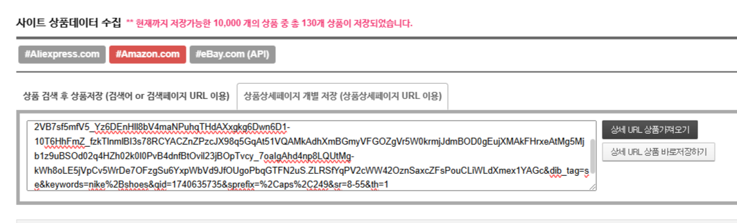 상품 수집을 원하는 수집사이트의 상품 상세페이지 URL 을 입력하신 후상세 URL 상품가져오기버튼을 클릭합니다.