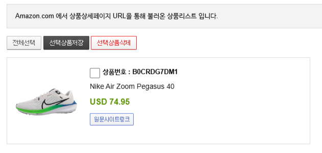가져온 상품 정보를 확인하고,선택상품저장 버튼을 클릭하여 상품을 저장합니다.