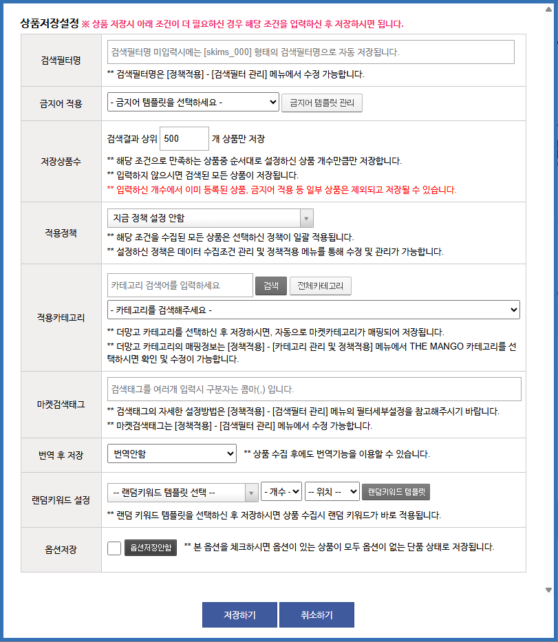 상품 저장 시 아래 조건을 통해 상품을 필터링하여 저장할 수 있습니다.