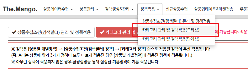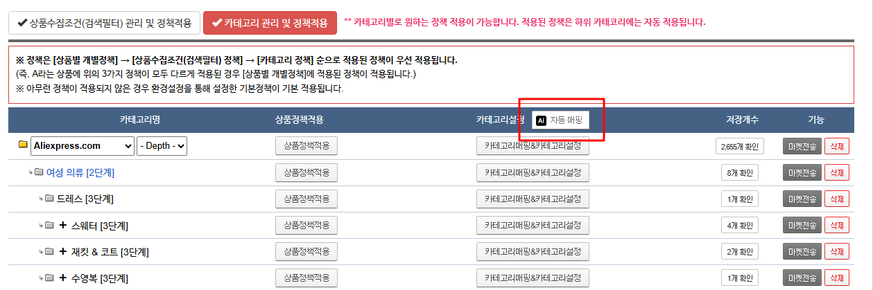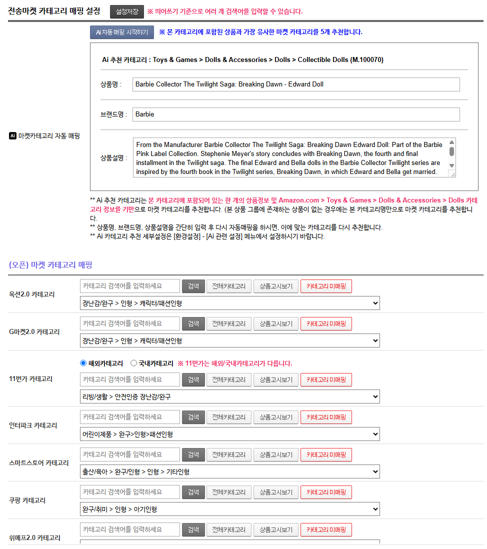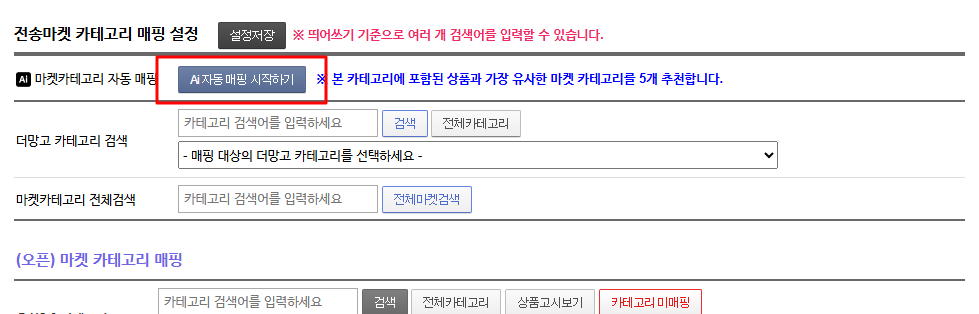 상품 카테고리 및 검색필터의 마켓 카테고리 매핑 시, AI를 통한 카테고리 자동 매핑 서비스를 이용할 수 있습니다.