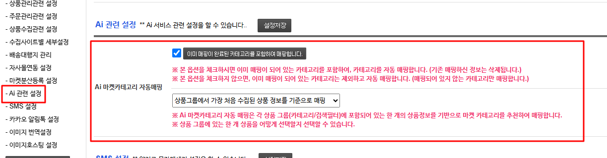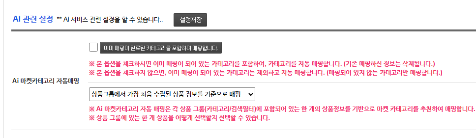 [환경설정] - [AI 관련 설정]에서 기존 수동 매핑 카테고리 제외 여부를 설정할 수 있습니다.
