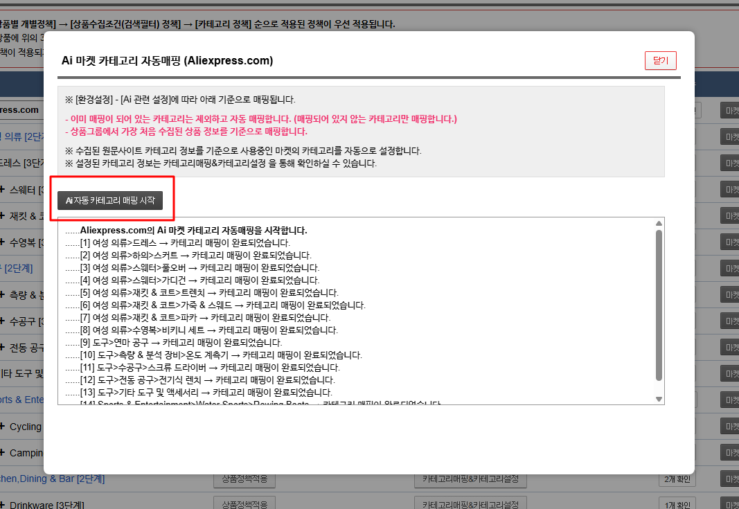 자체 AI 모델을 통해 수집사이트 카테고리를 마켓 카테고리에 자동으로 매핑할 수 있습니다.