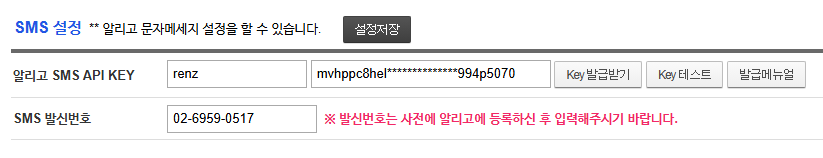 발급 받은 API KEY 및 발신번호를 [환경설정] - [SMS 설정] 메뉴에서 추가하시면 됩니다.