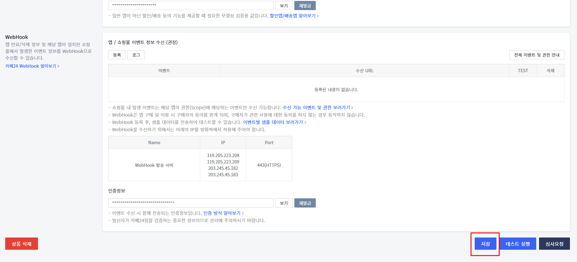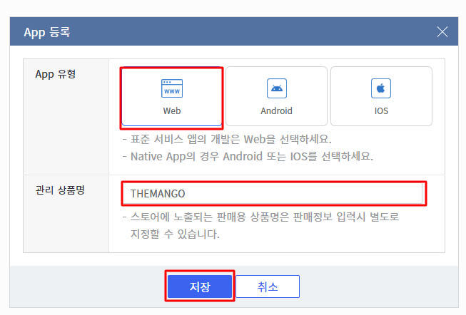 설정이 완료되었으면 하단의 저장버튼을 통해 App 등록을 완료합니다.
