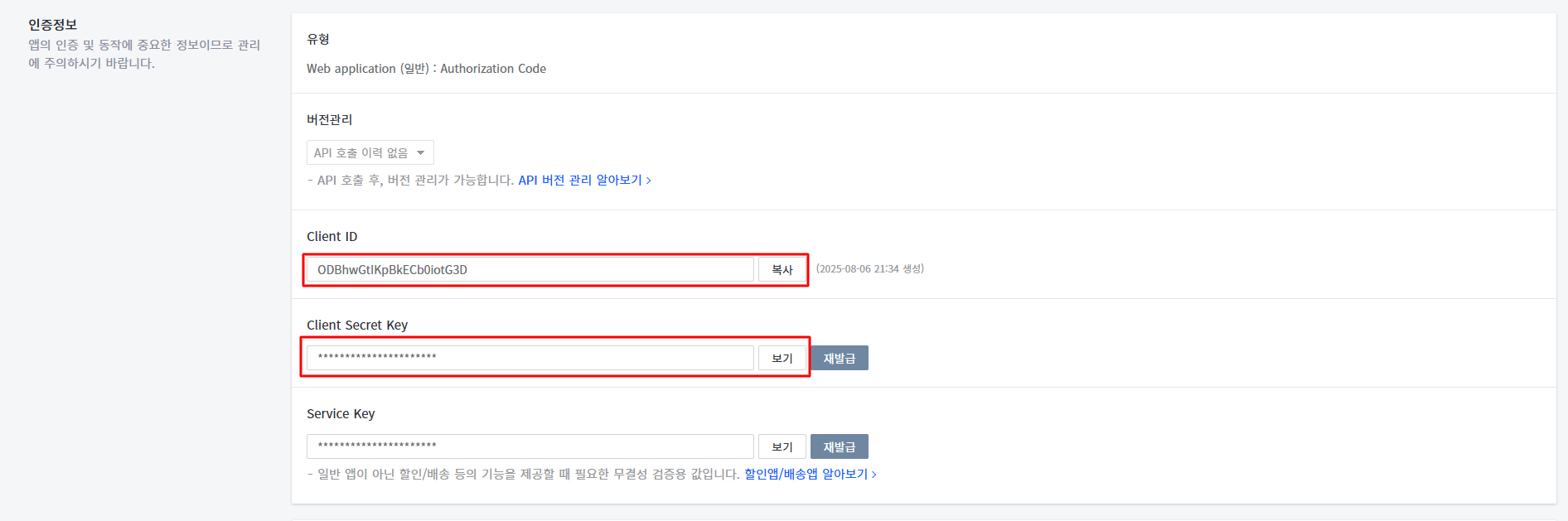 등록된 App 의 인증정보에서 Client ID 와 Secret Key 를 복사하여 입력합니다.