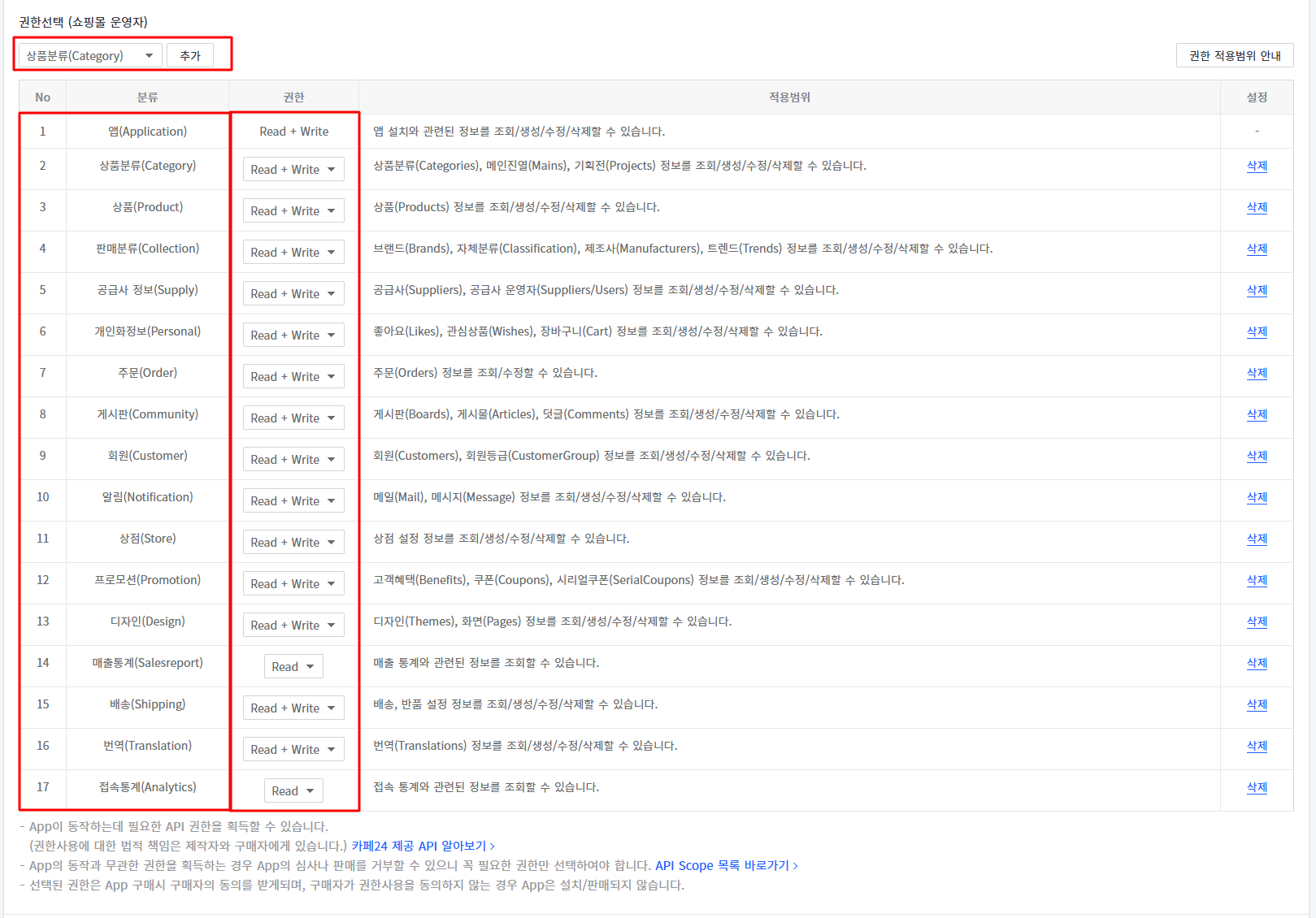 Read+Write 권한이 없는 항목은 Read로 설정합니다.