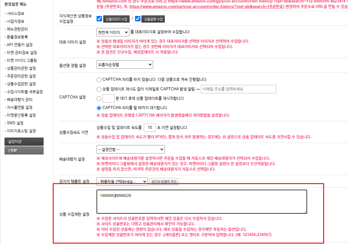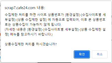 [환경설정] - [수집사이트별 세부설정]에서 수집을 원하지 않는 상품번호를 입력하면, 이후 해당 상품은 수집되지 않습니다.