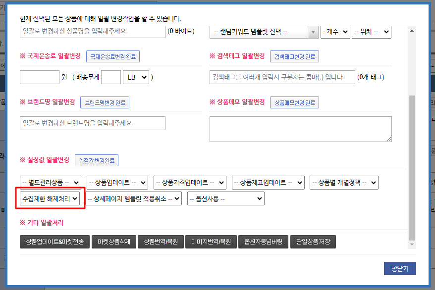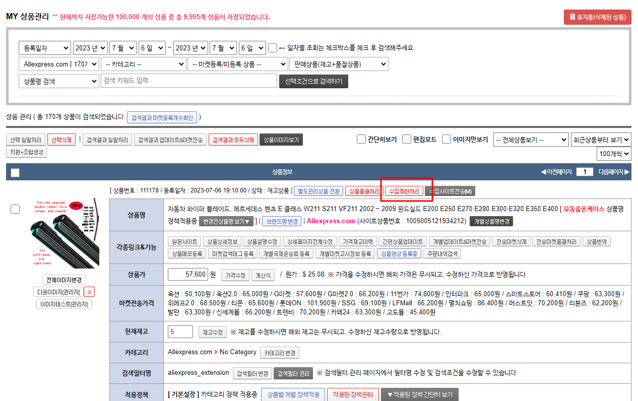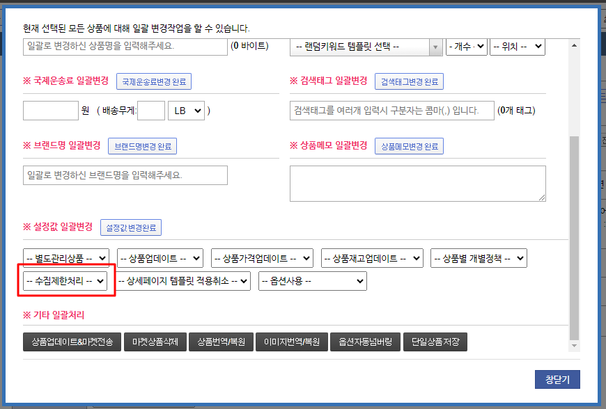 일괄처리 기능에서 수집제한 처리가 가능합니다. 여러 상품을 선택하여 한번에 수집을 제한할 수 있습니다.