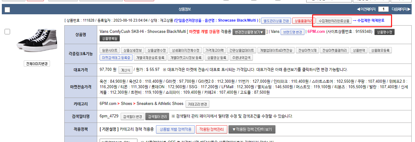 상품관리 페이지에서 버튼을 클릭하여 해당 상품번호를 바로 수집제한에 적용할 수 있습니다.