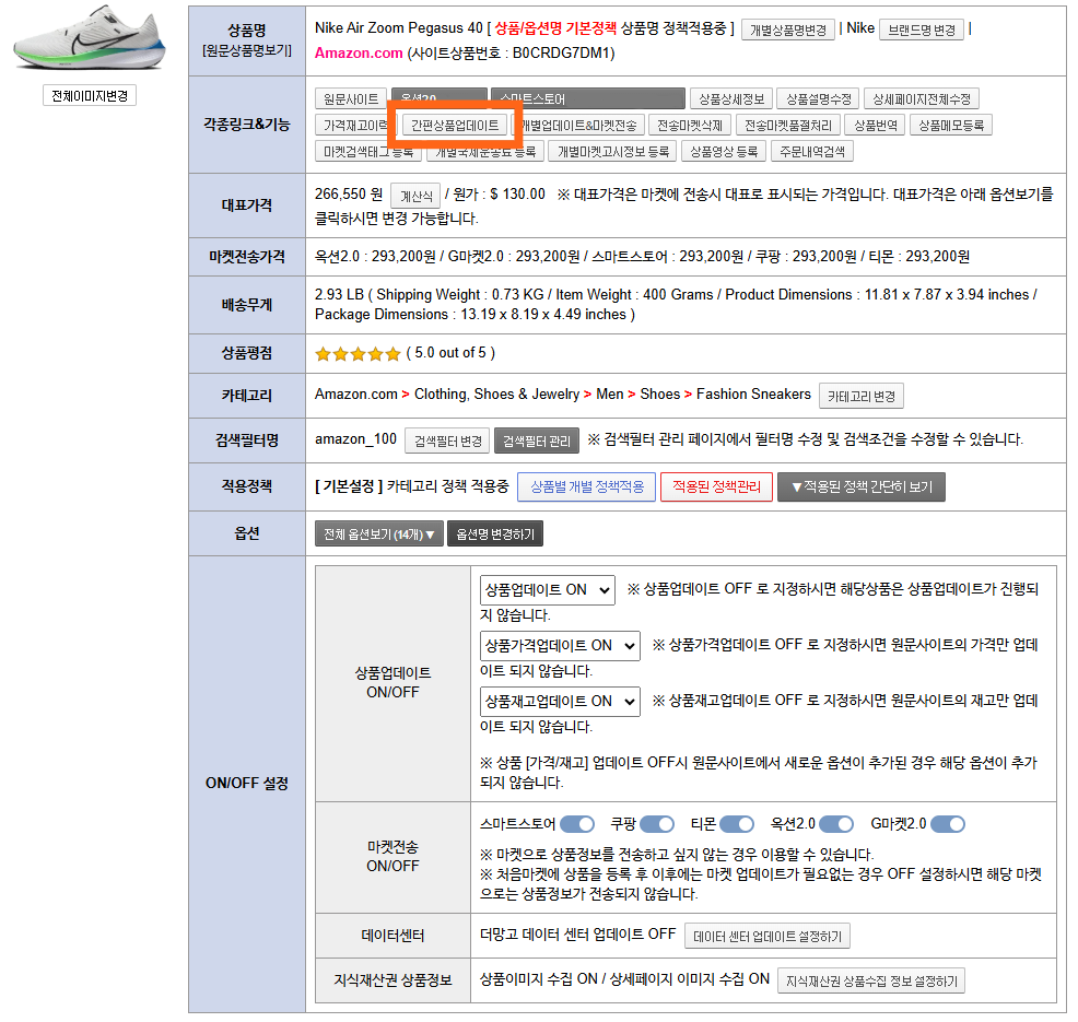 각종링크&기능의 [간편상품업데이트] 버튼을 클릭하면 바로 수집 팝업창 또는 수집탭이 나타나며 상품이 업데이트됩니다.
