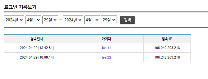 로그인 아이디(부관리자)에 대한 로그인 시간 및 접속 IP 등을 확인할 수 있습니다.