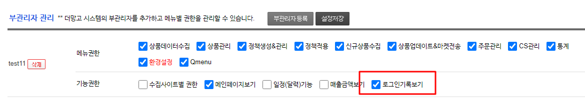 부관리자에게 로그인 내역 조회 권한을 부여하려면 [환경설정] - [부관리자 관리] 메뉴에서 설정합니다.