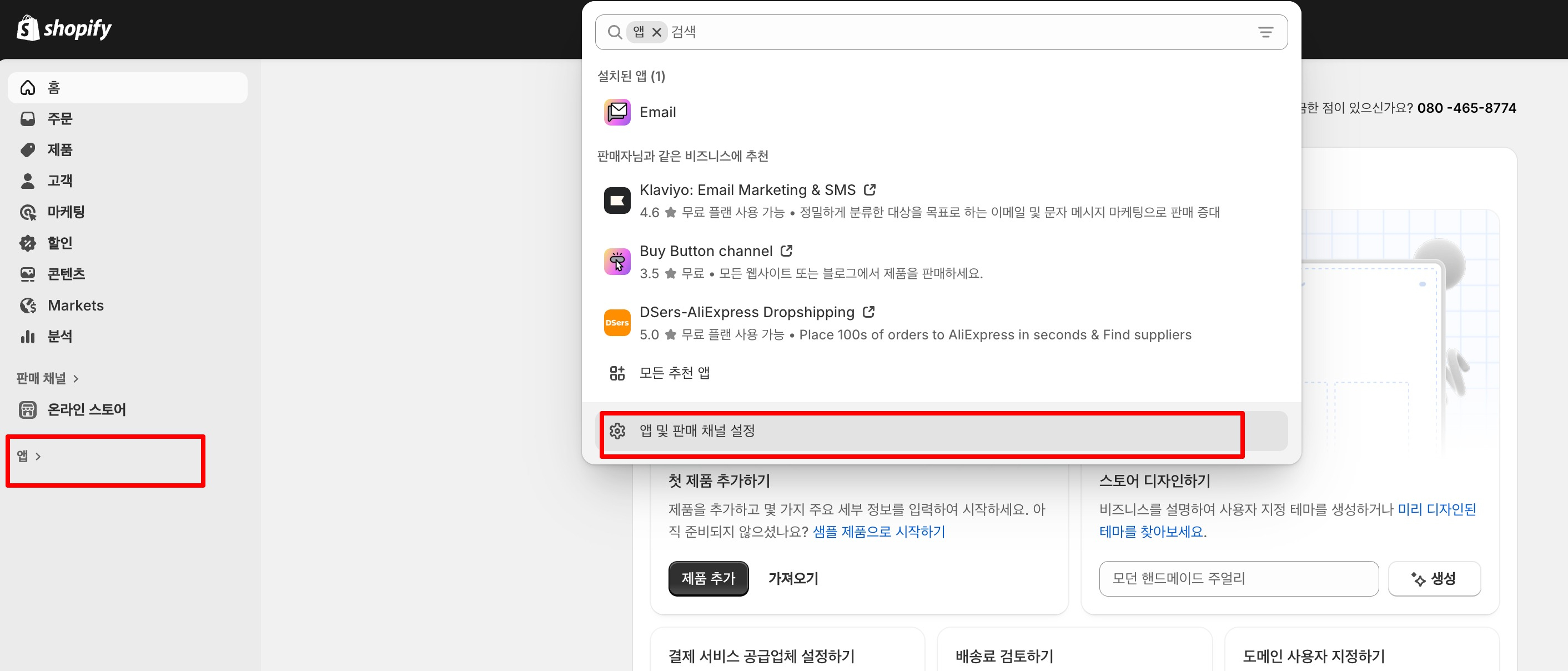 설정 화면 하단 앱 클릭하면 아래와 같이 "앱 및 판매 채널 설정"