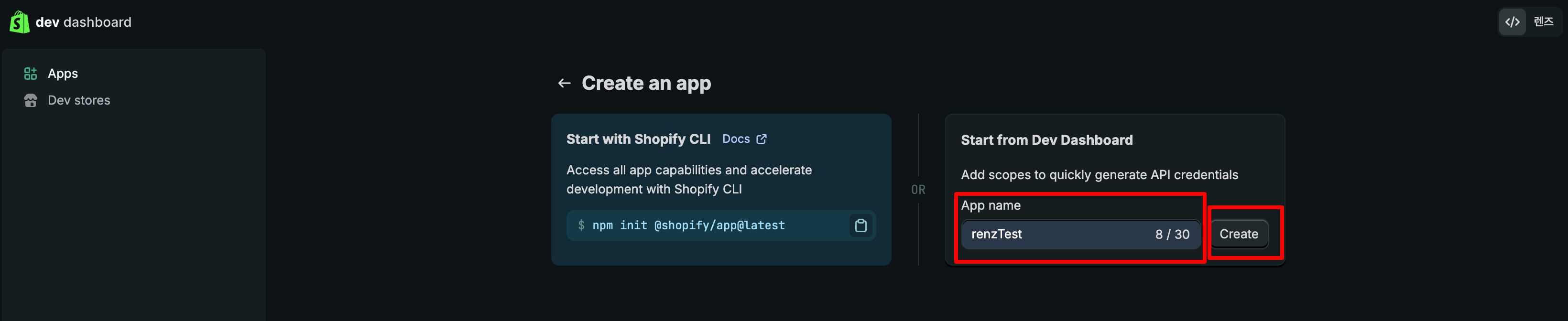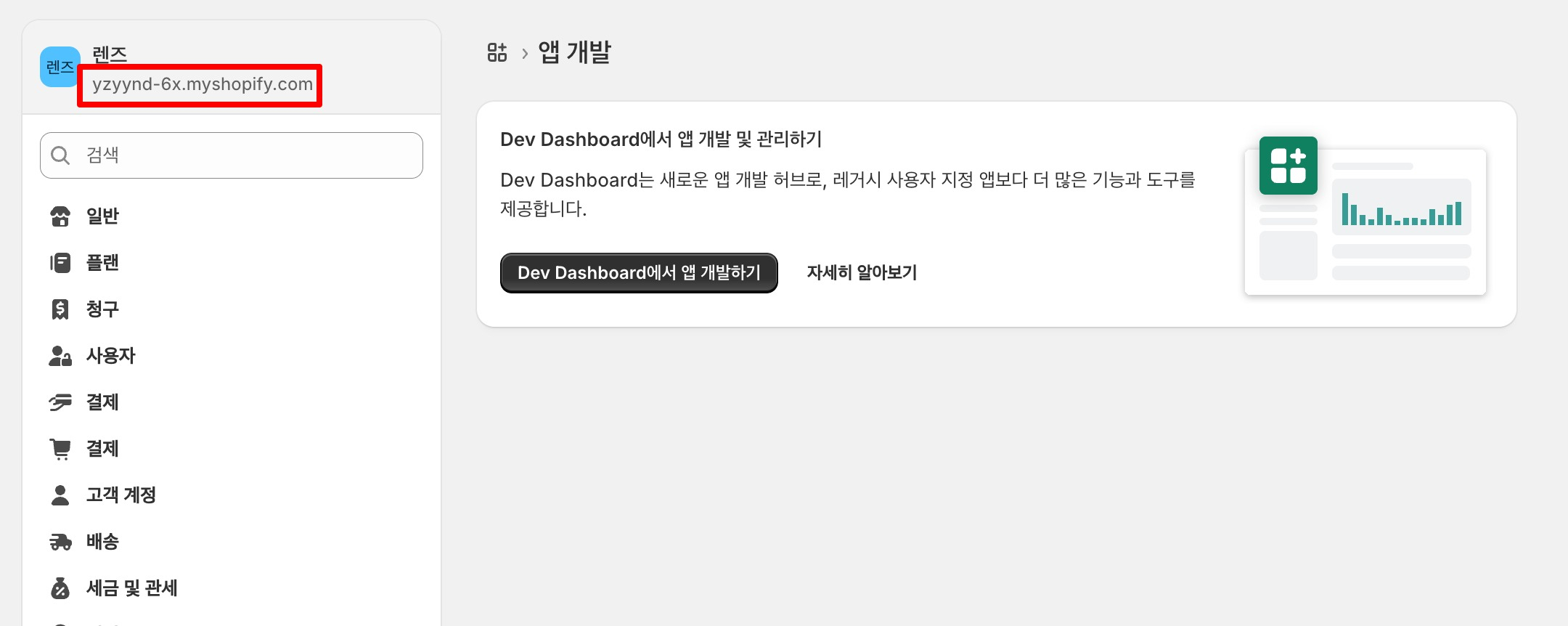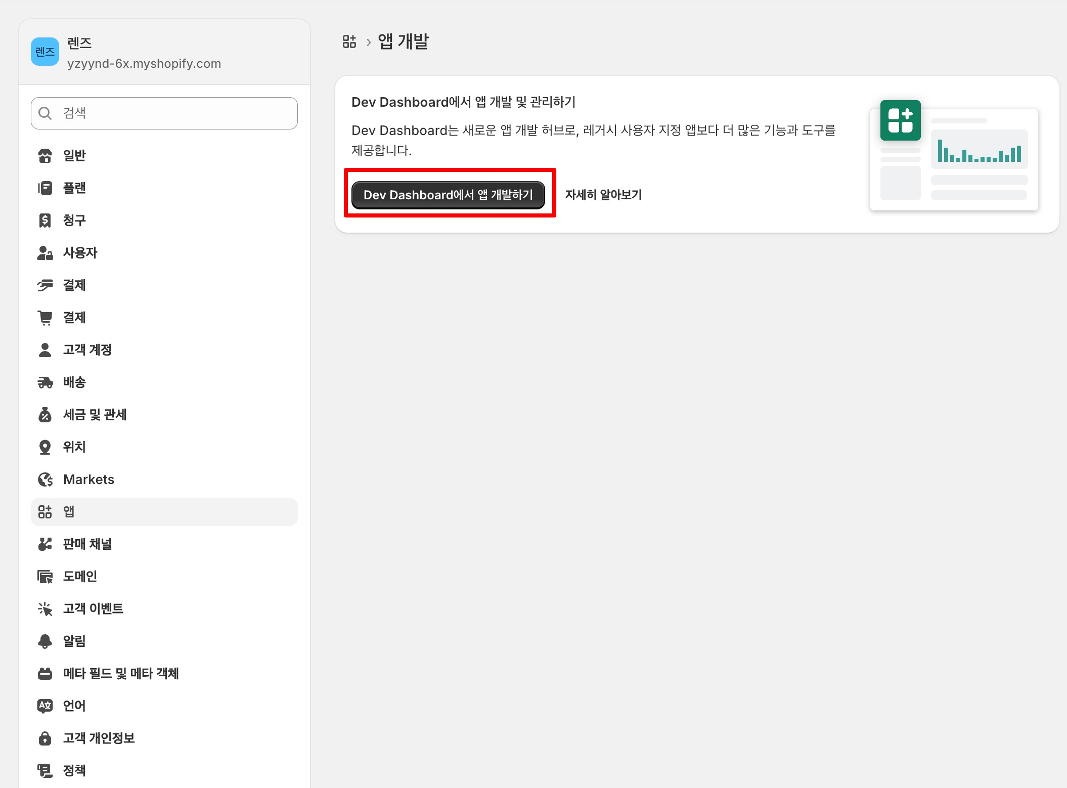 Dev Dashboard에서 앱 개발하기 버튼을 클릭해 주세요.