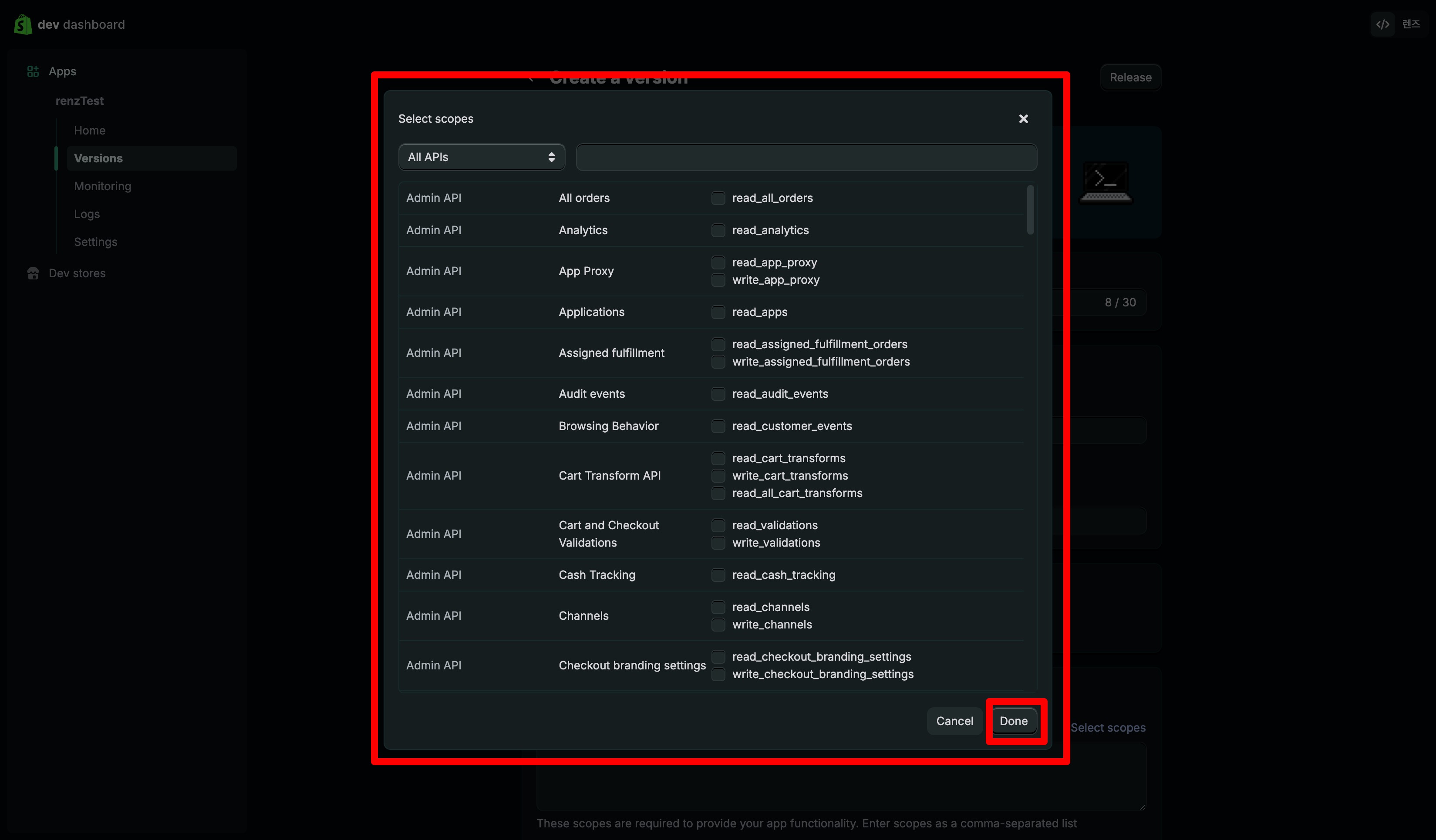 창 안에 있는 체크 박스를 전체 다 체크해 주시고 Done 버튼을 클릭해 주세요.