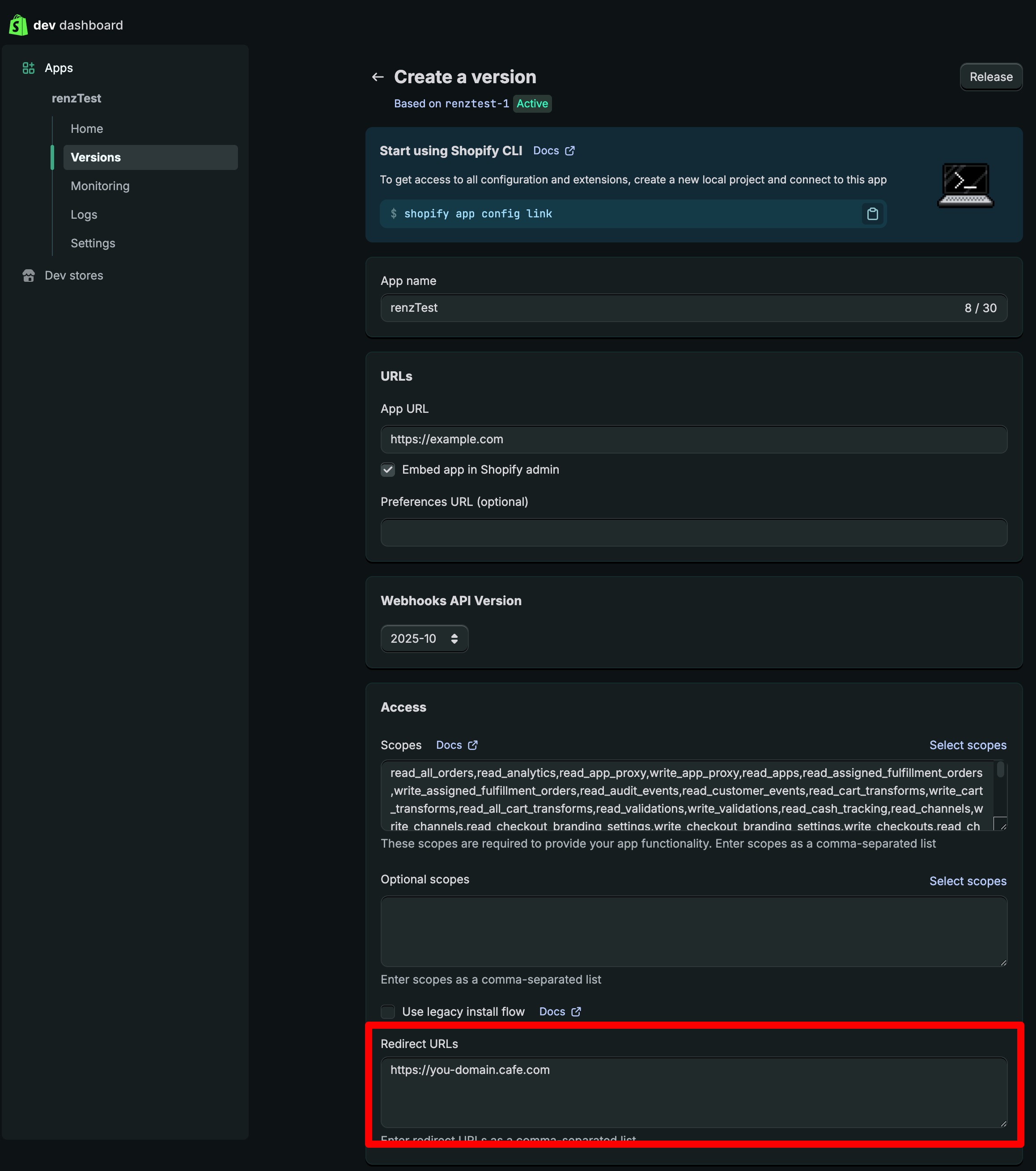 Redirect URLs는 서비스 URL에 "/api/shopify/getToken"을 추가하여 설정합니다.