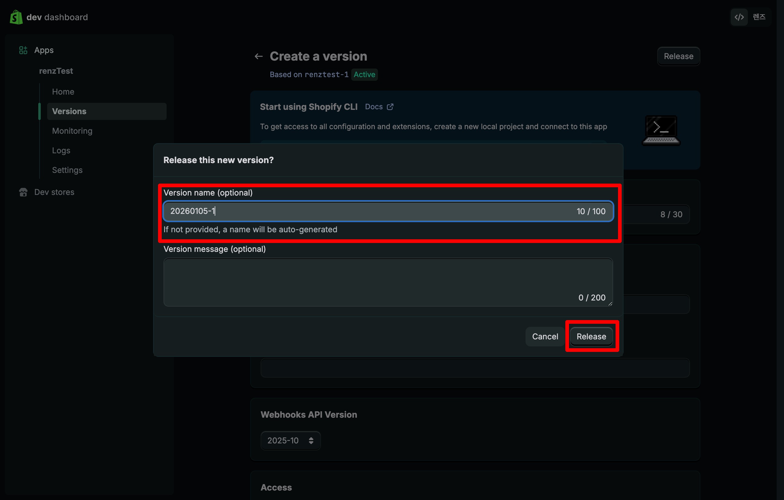 등록한 내용에 대한 버전명을 입력하신 후 Release 버튼을 클릭하세요.