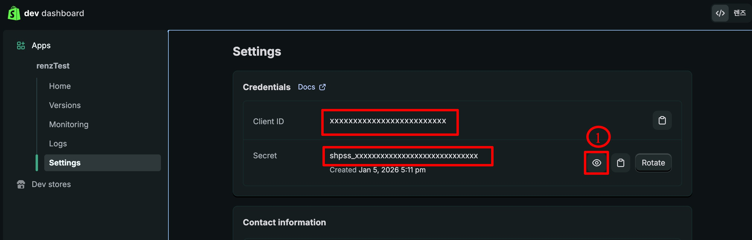 Client ID는 바로 보이지만 Client Secret 번호는 보이지 않습니다. 눈 모양 아이콘을 클릭하시면 Client Secret이 보입니다.