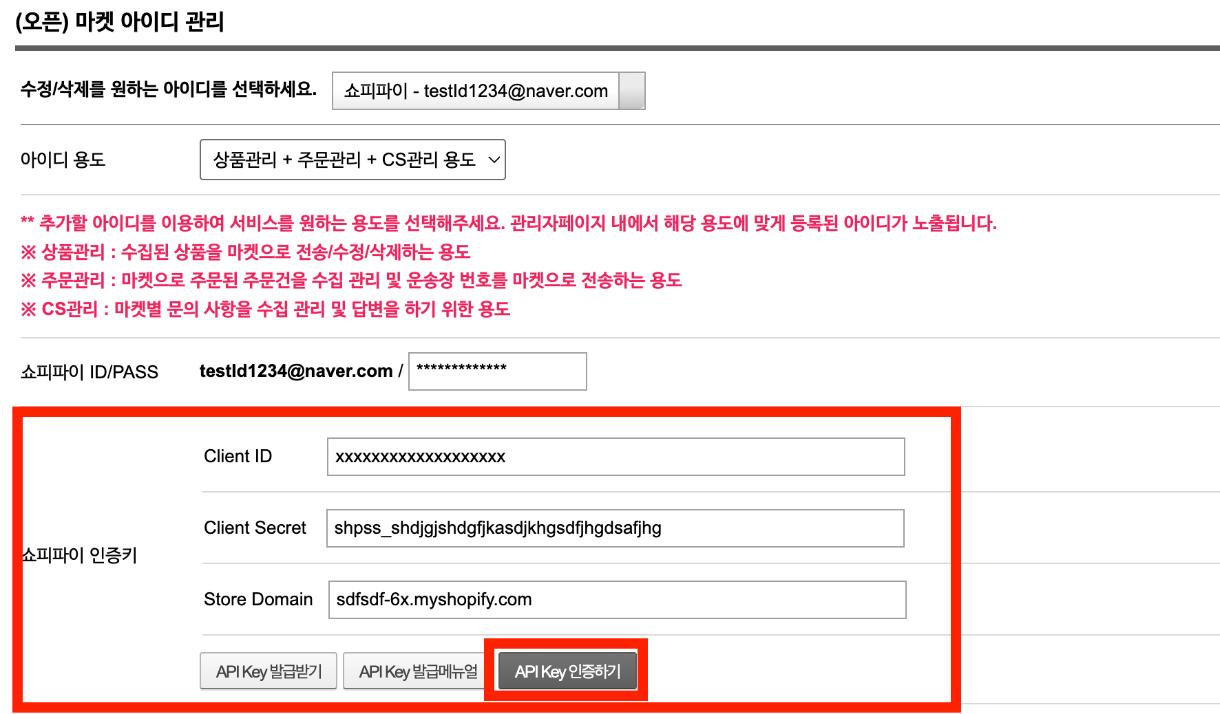위에서 확인한 Client ID, Client Secret, Store Domain을 입력하고 API Key 인증하기 버튼을 클릭합니다.