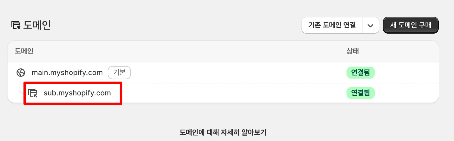 아래 이미지와 같이 main.myshopify.com 하나만 있다면, sub.myshopify.com으로 연결된 도메인을 아래 13. 더망고 솔루션 정보 입력의 Store Domain에 입력해 주세요.